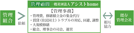 一般社団法人アシストhome は、所有者( オーナー様) 及び住民、理事等の高齢者化またマンション自体の老朽化により、低迷している 管理組合運営の活性について啓蒙し、 行政書士、司法書士、弁護士、マンション管理士を はじめとする法及び不動産関係の専門知識を持つ 専門家たちが、管理組合運営に高齢者雇用及び マンション自体の資産価値活性化に貢献することを 目的としています。⇒お問合せはコチラ